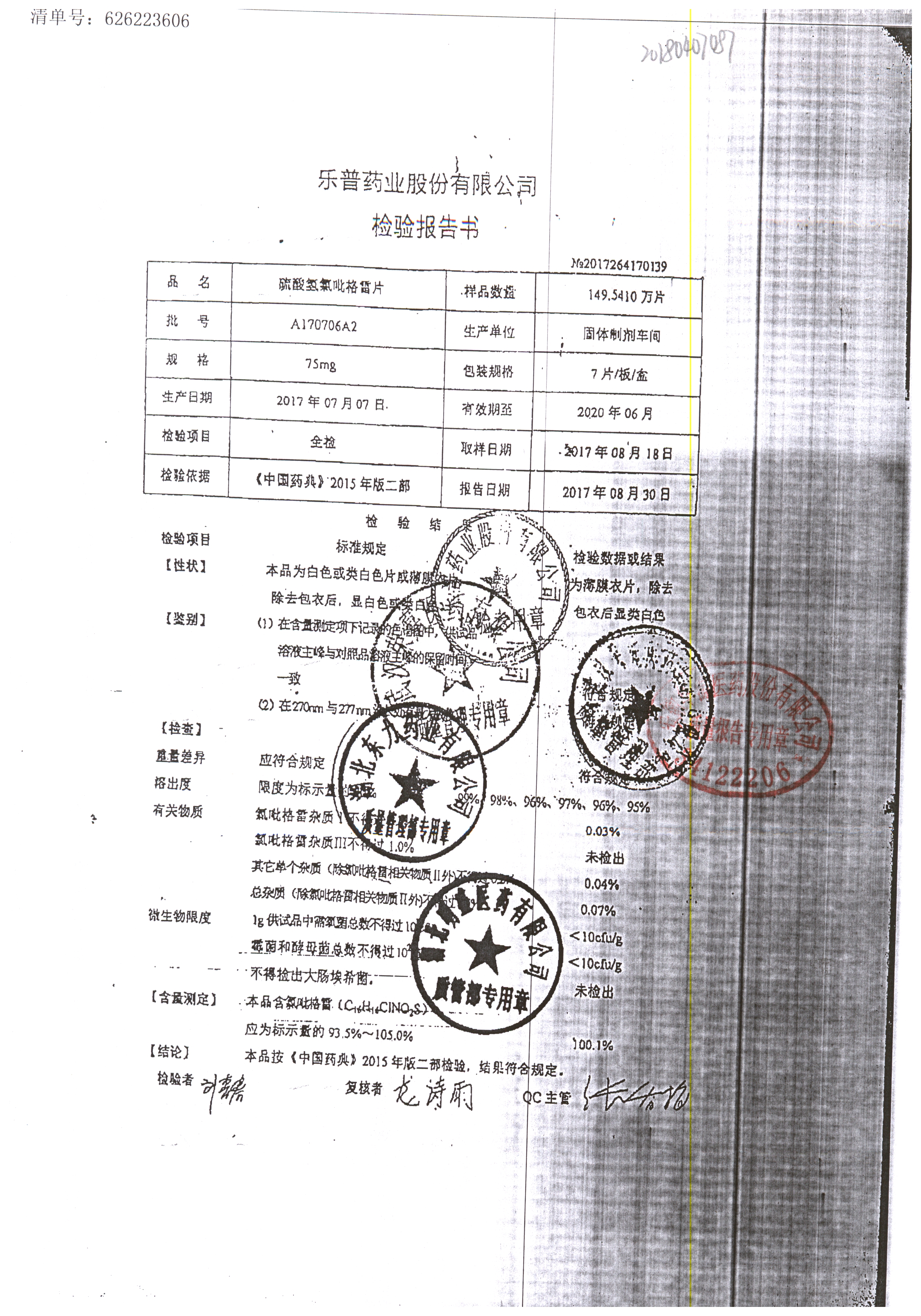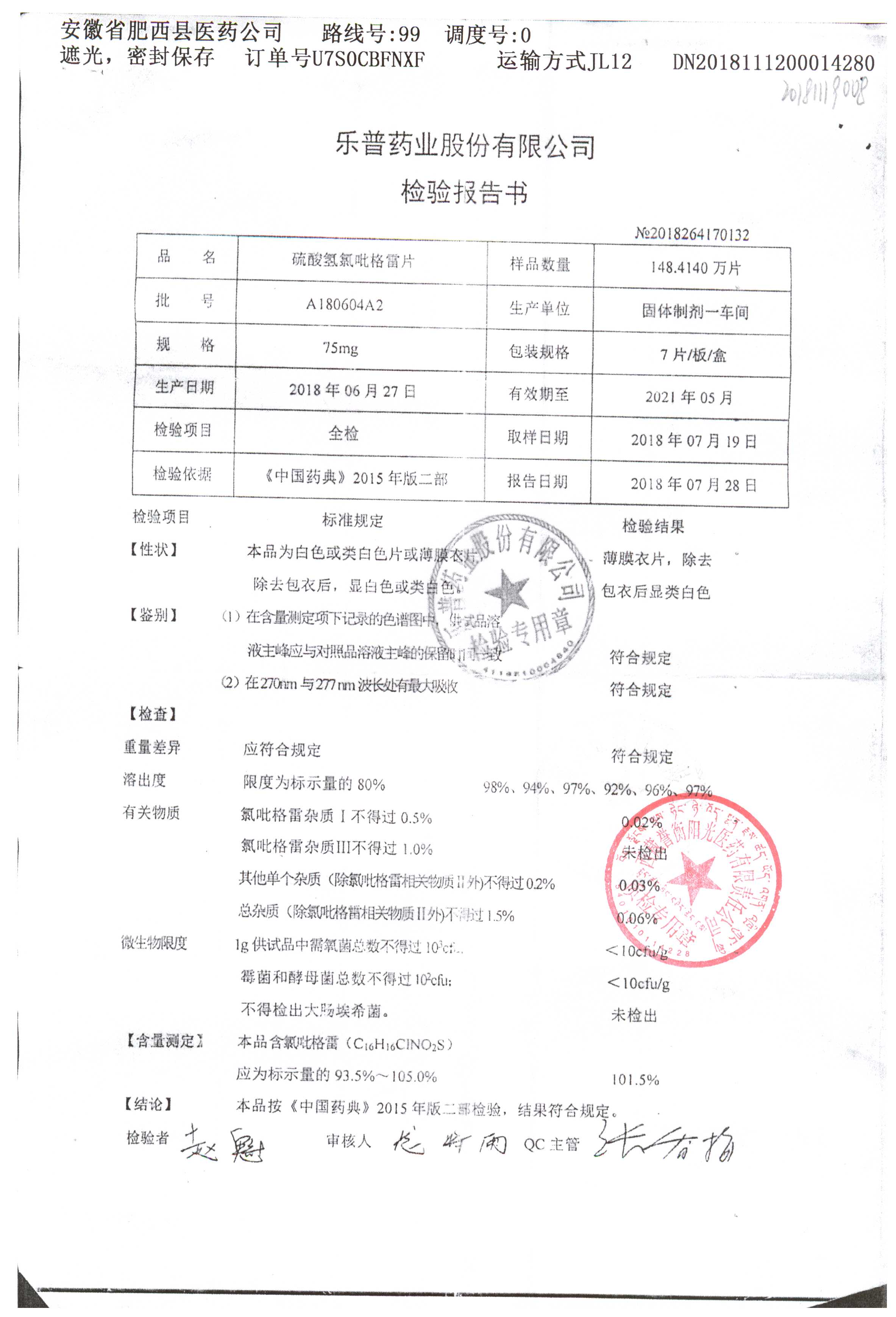 | 硫酸氫氯吡格雷片 | 75mg*7片 | A180604A2 | 查看詳情 |