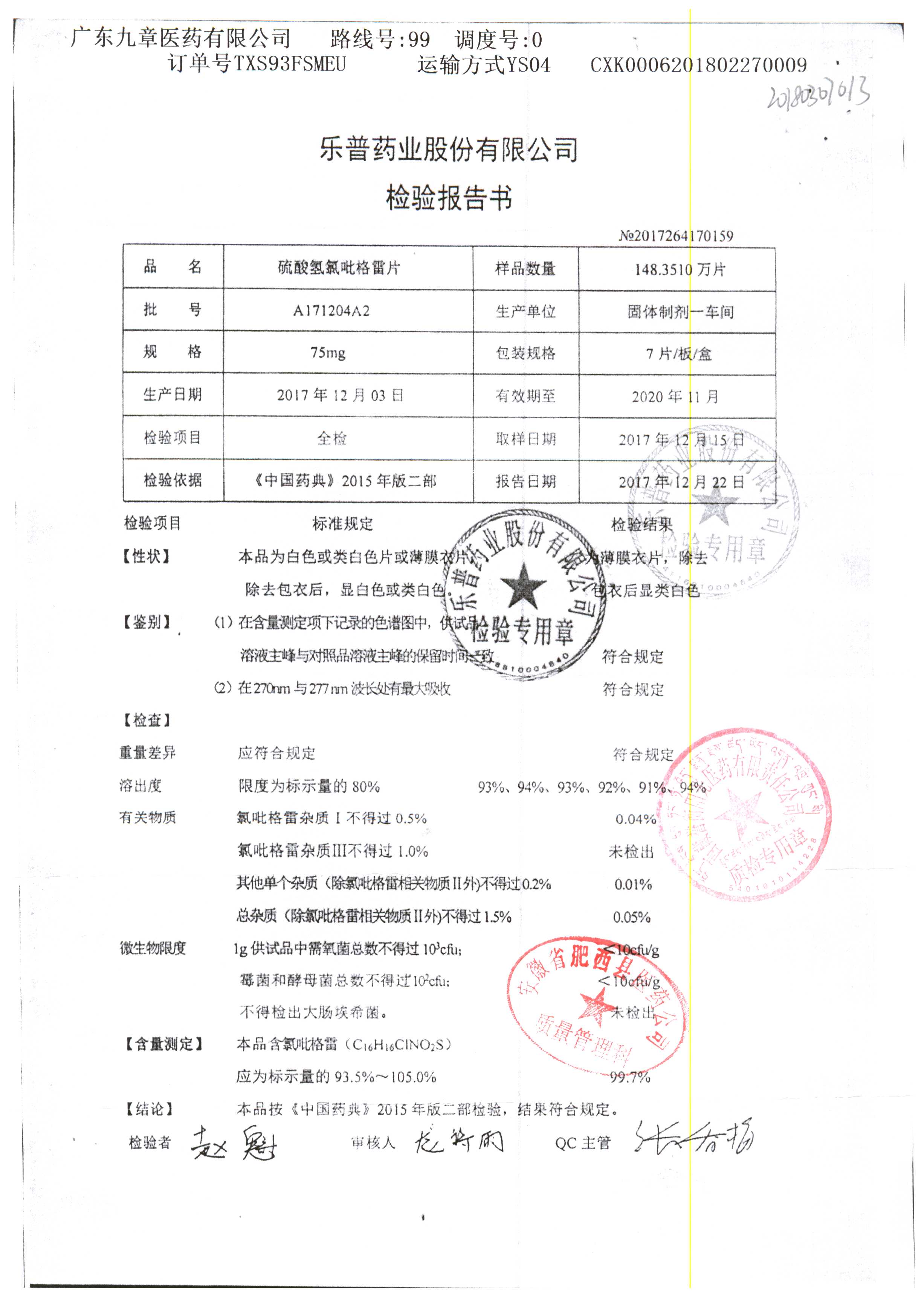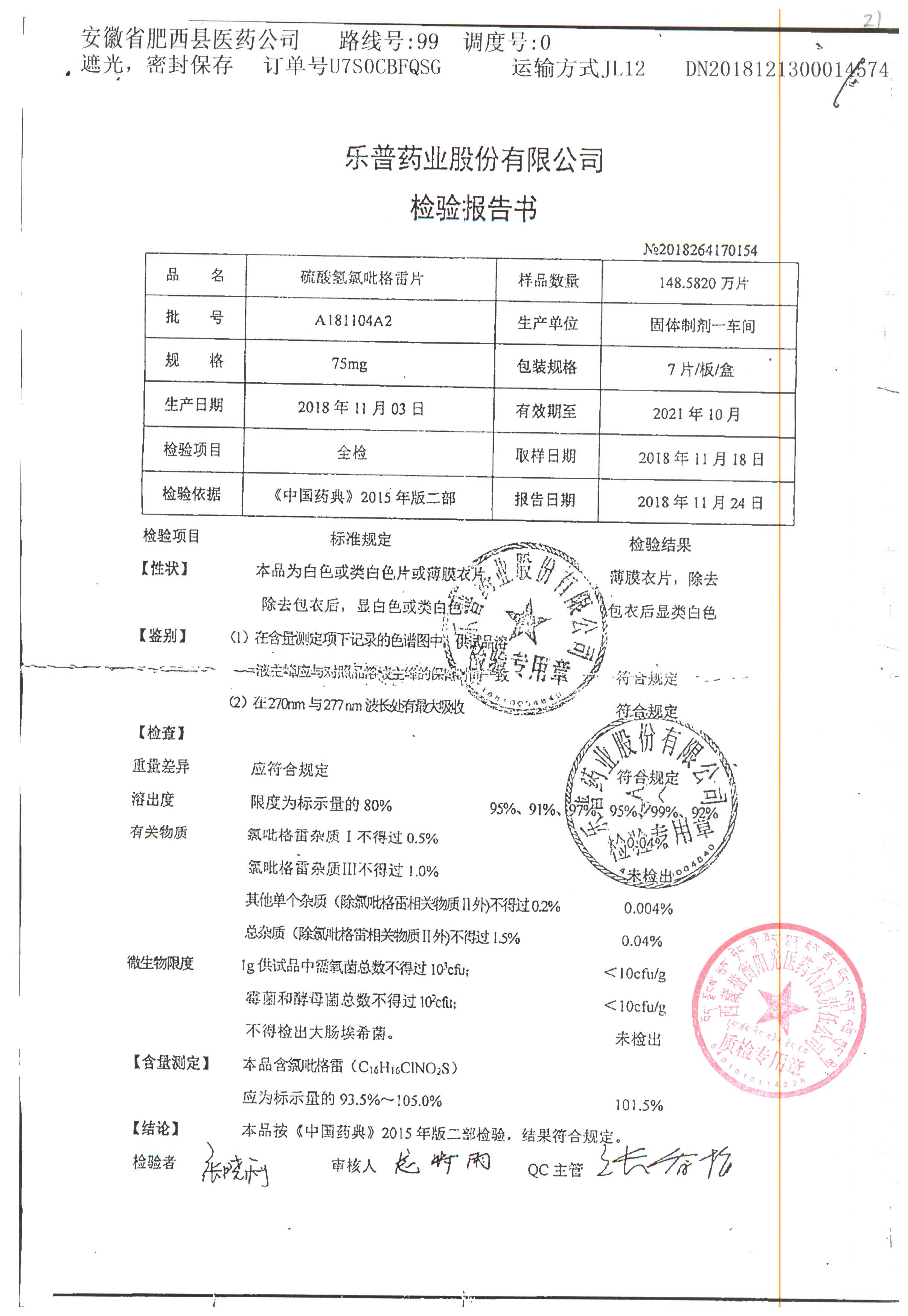 | 硫酸氫氯吡格雷片 | 75mg*7片 | A180304A2 | 查看詳情 |