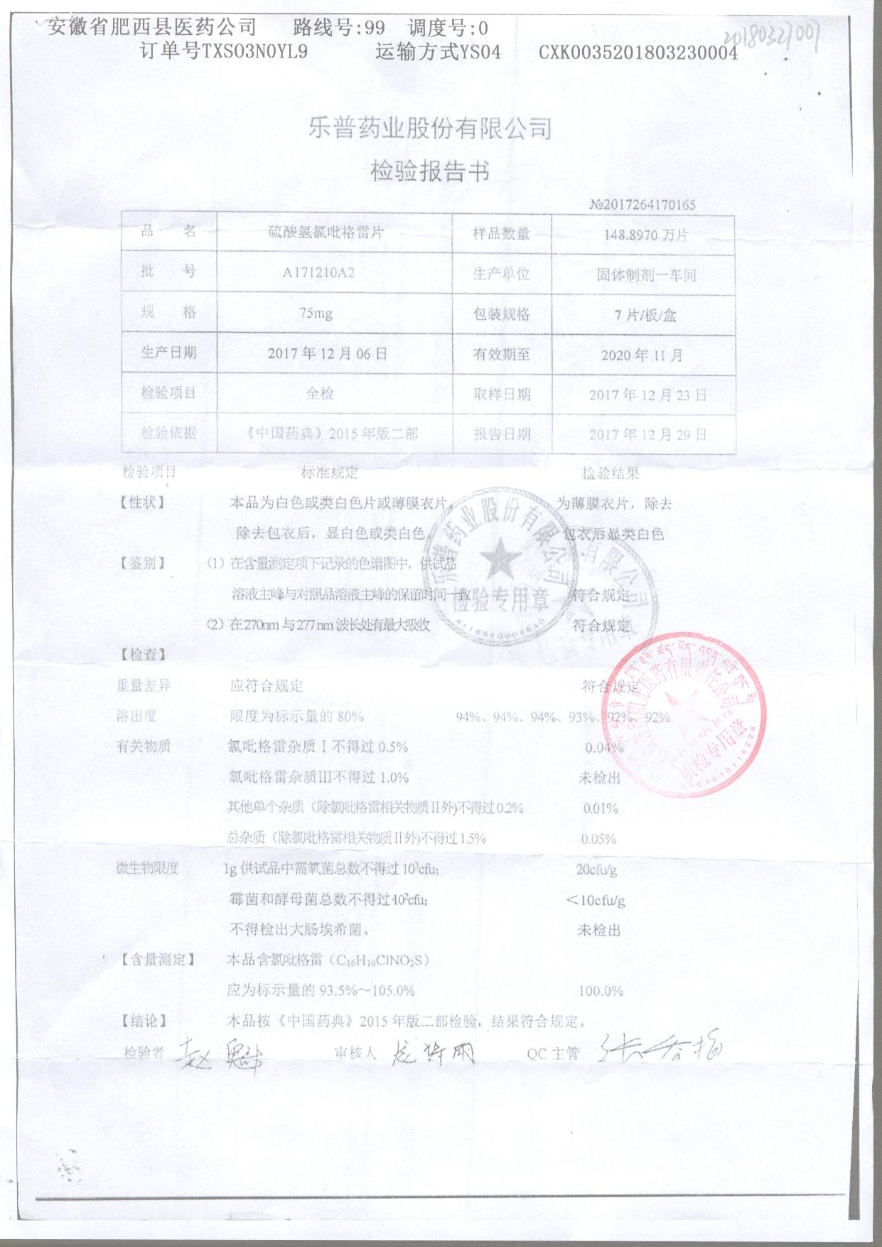 | 硫酸氫氯吡格雷片 | 75mg*7片 | A180201A2 | 查看詳情 |