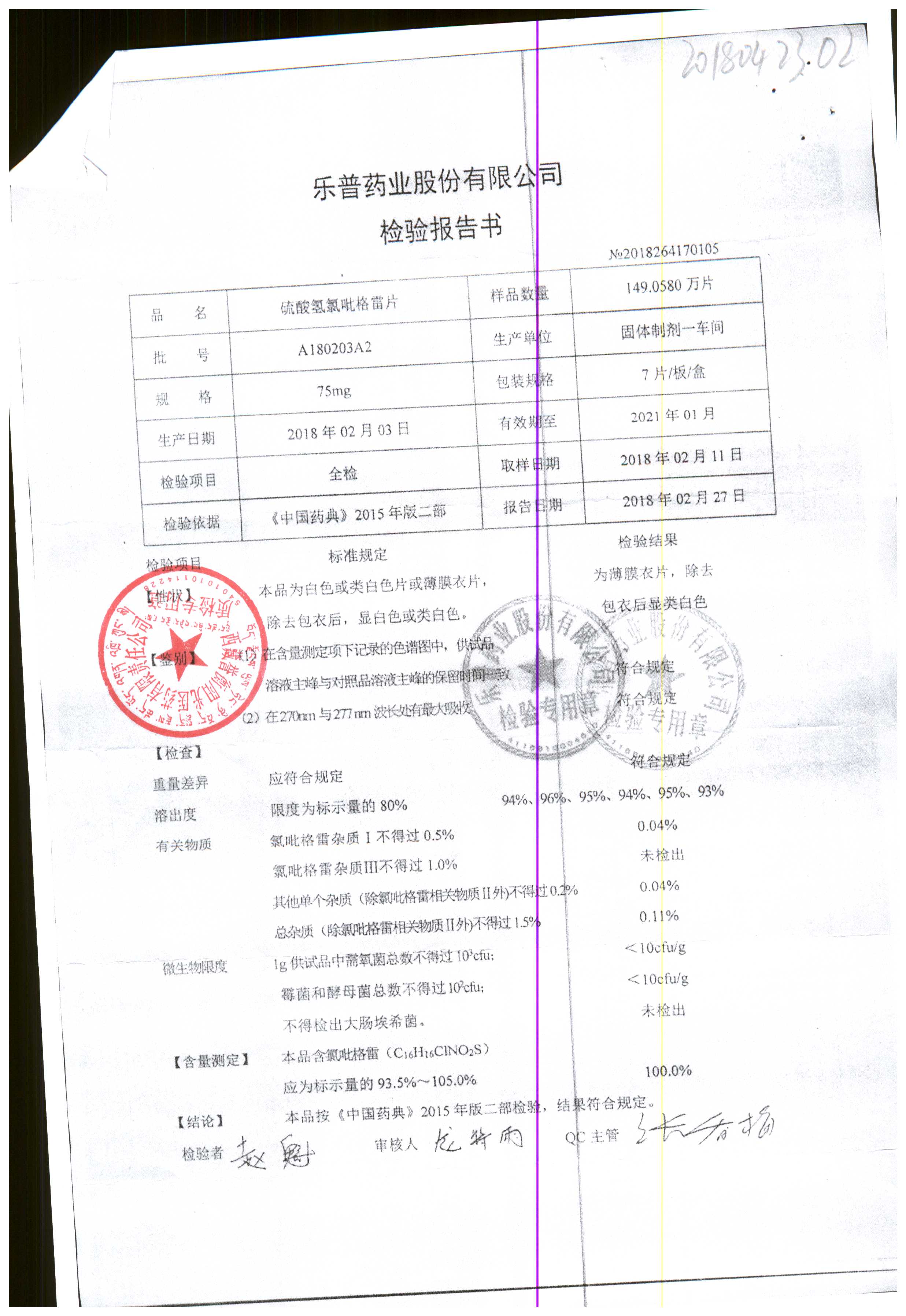 | 硫酸氫氯吡格雷片 | 75mg*7片 | A180402A2 | 查看詳情 |