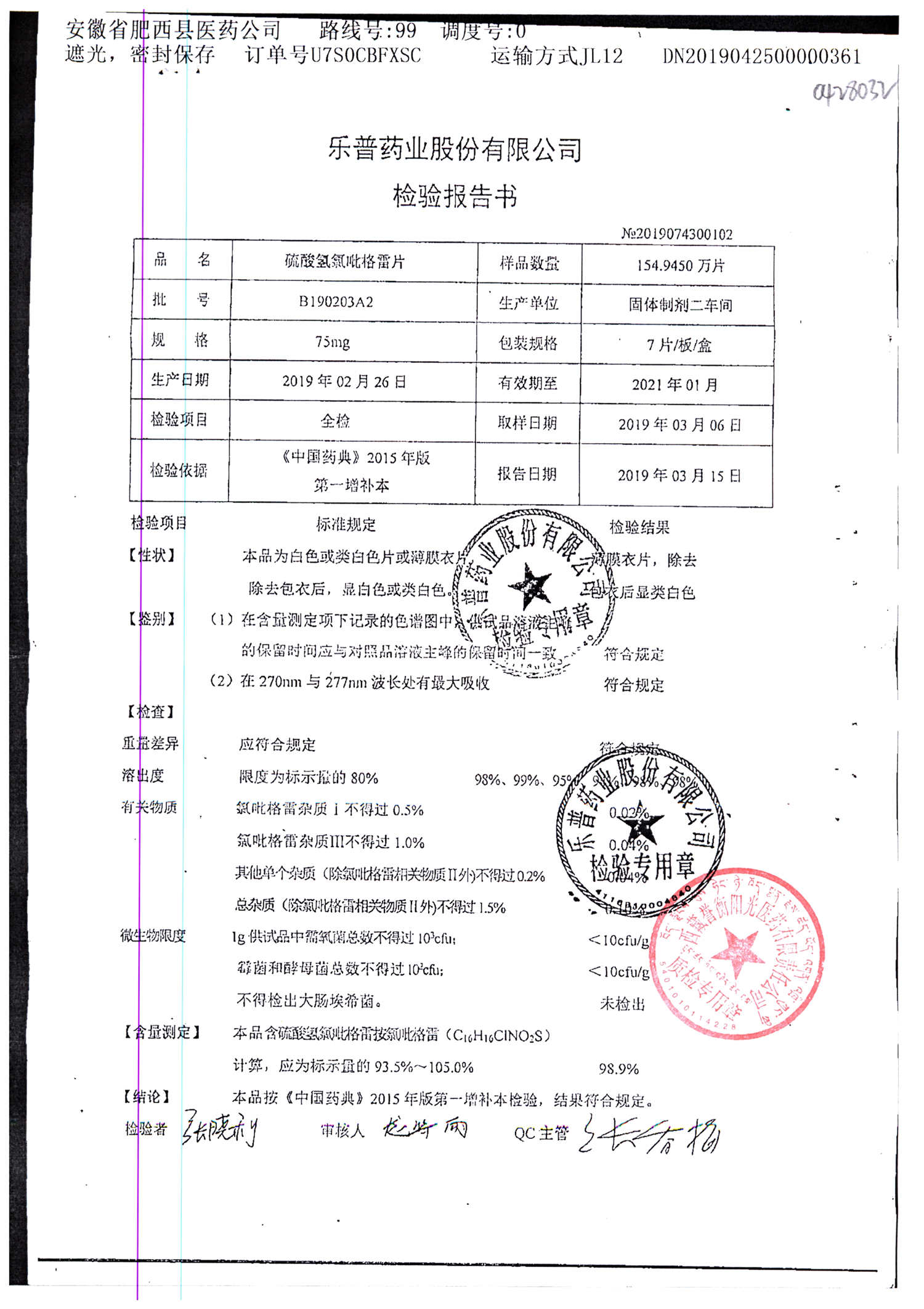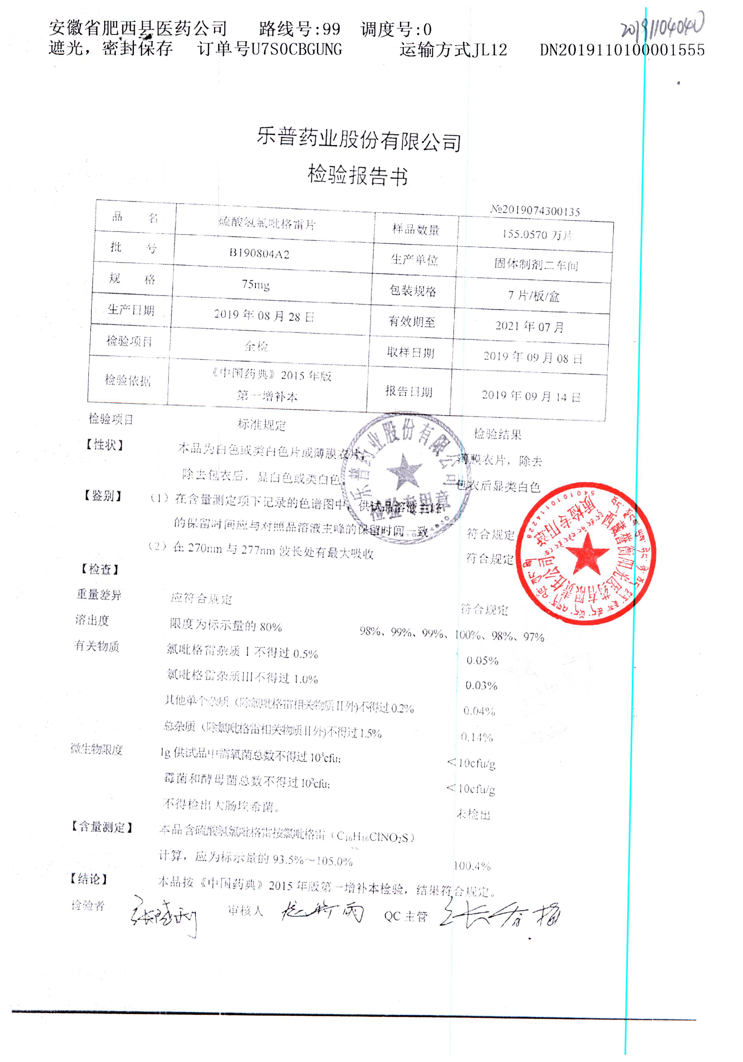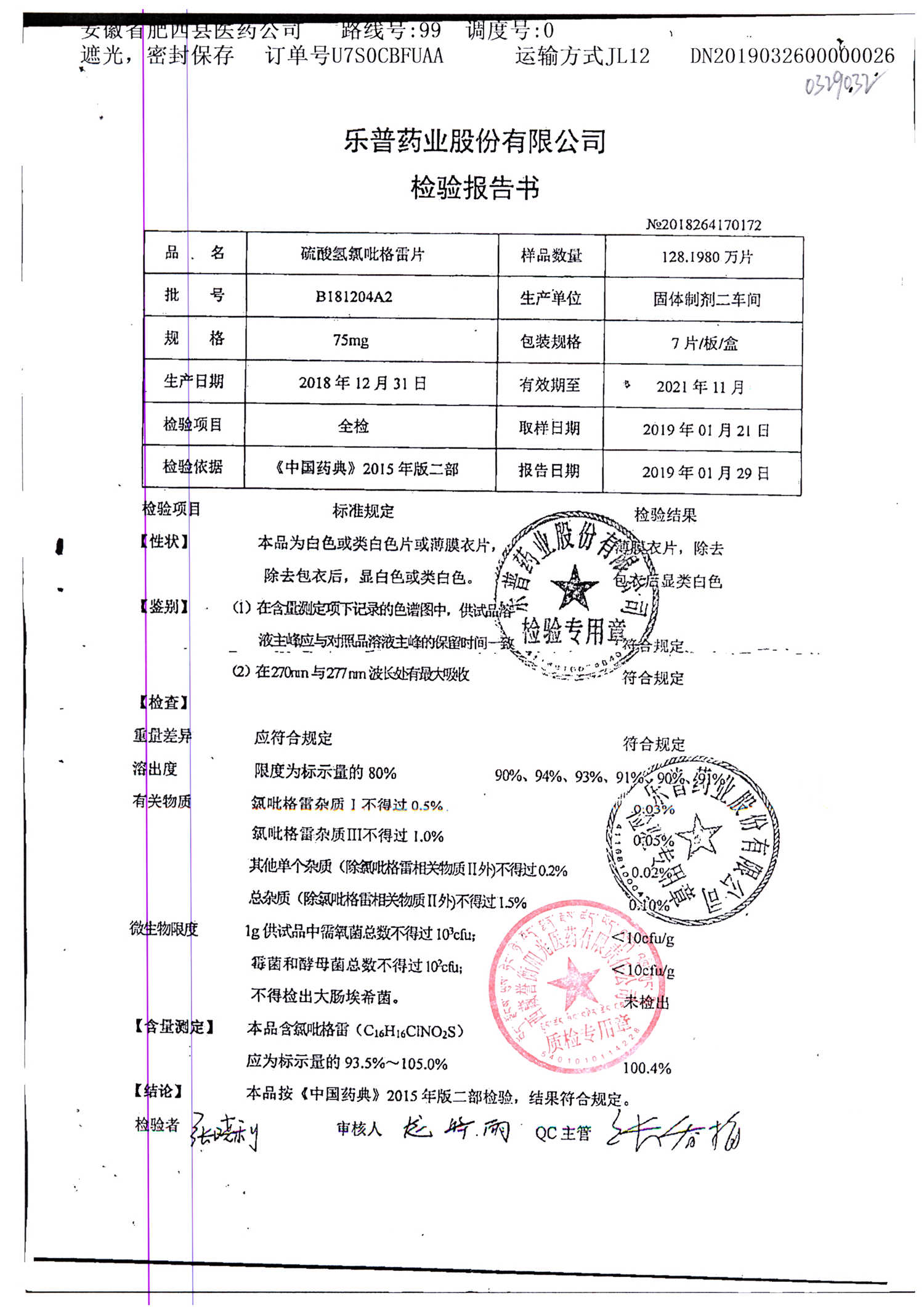 | 硫酸氫氯吡格雷片 | 75mg*7片 | B190410A2 | 查看詳情 |