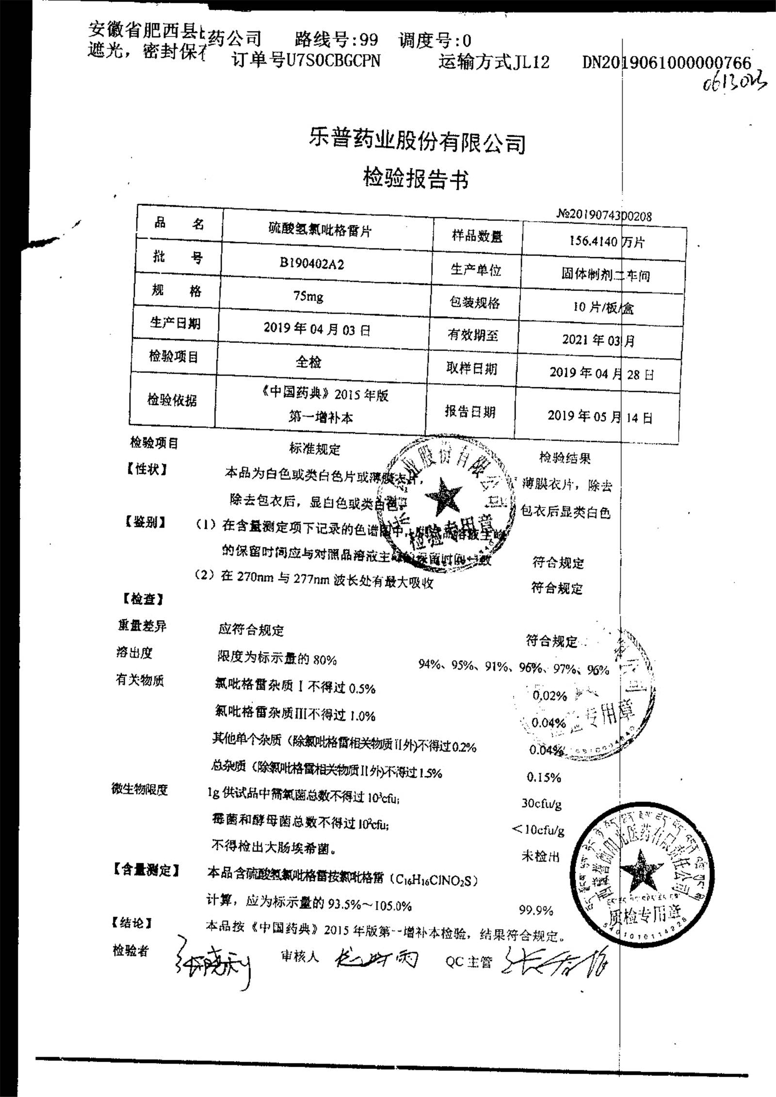 | 硫酸氫氯吡格雷片 | 75mg*7片 | B190402A2 | 查看詳情 |