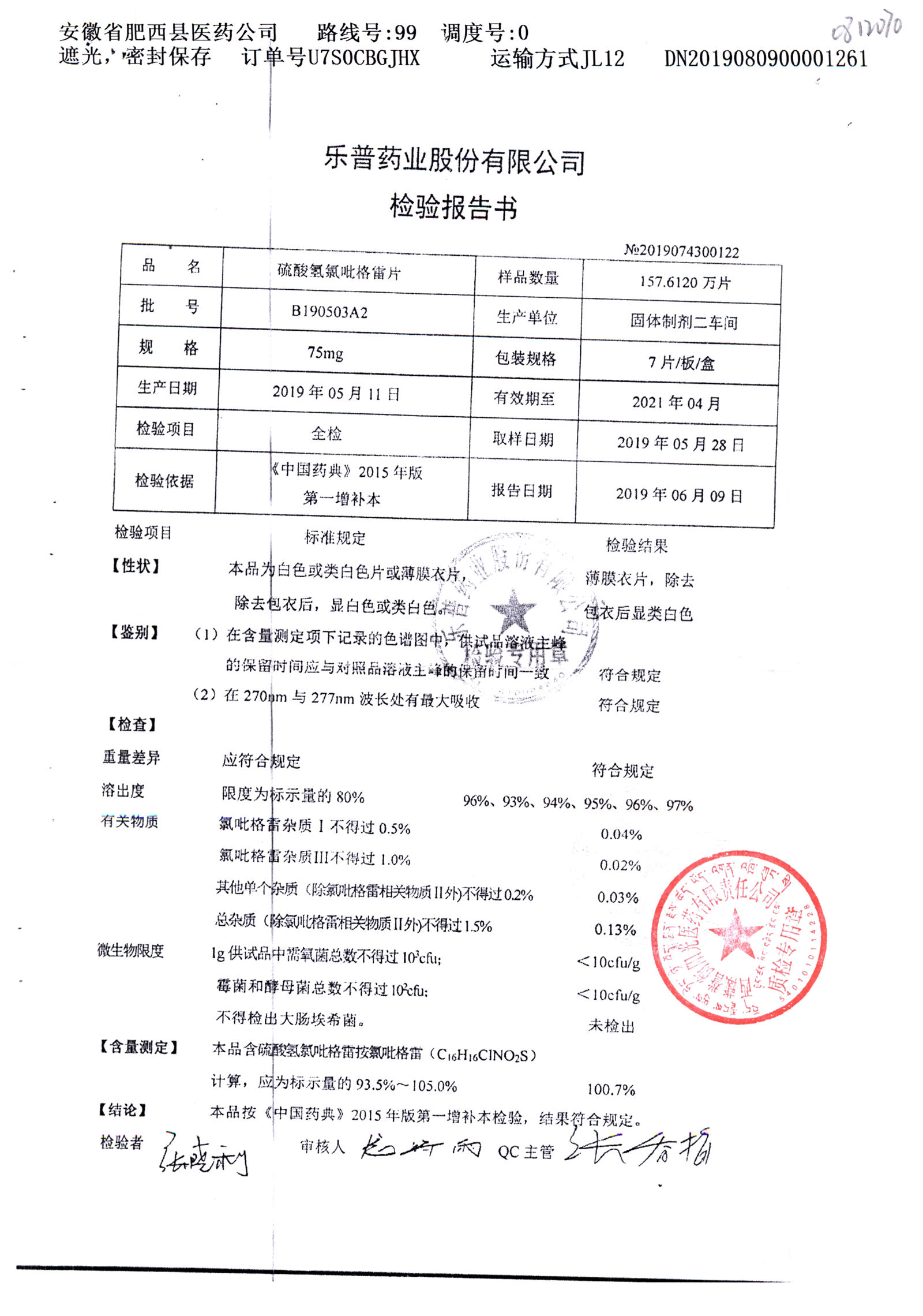 | 硫酸氫氯吡格雷片 | 75mg*7片 | B190804A2 | 查看詳情 |